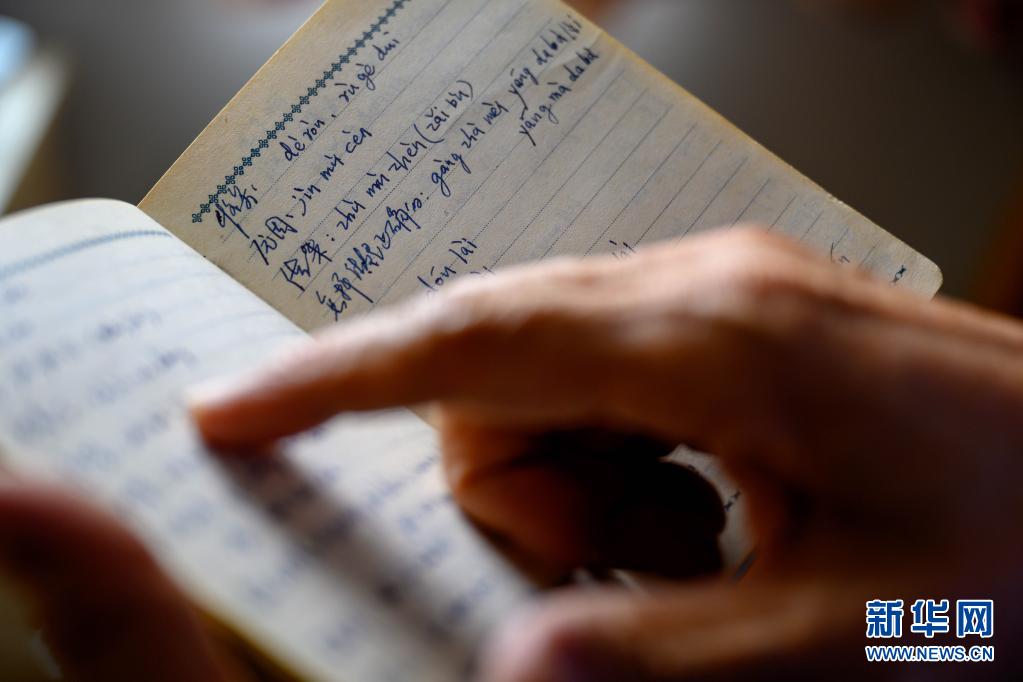 4月21日,李纯民在天津家中翻阅当年的藏语学习笔记。初到西藏时,李纯民利用业余时间自学藏语,为了方便记忆,他用汉语拼音标注藏语发音。 新华社记者 刘金海 摄