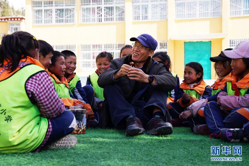 5月1日,在西藏昌都市类乌齐县伊日乡小学,李纯民(中)和学生们交流。新华社记者 黄臻 摄