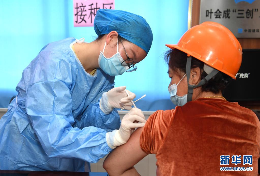 5月19日,合肥市双岗街道社区卫生服务中心工作人员为工地建设者接种新冠疫苗。