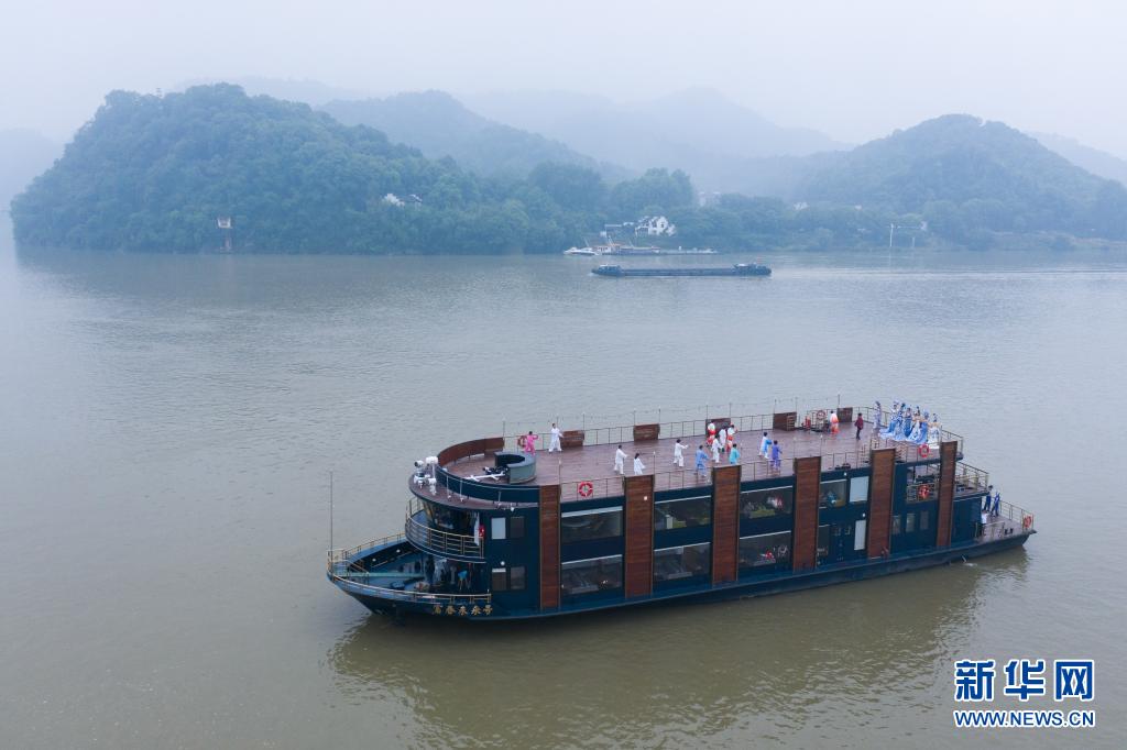 5月19日,太极拳爱好者在富春江的游船上展示太极拳八法五步(无人机照片)。