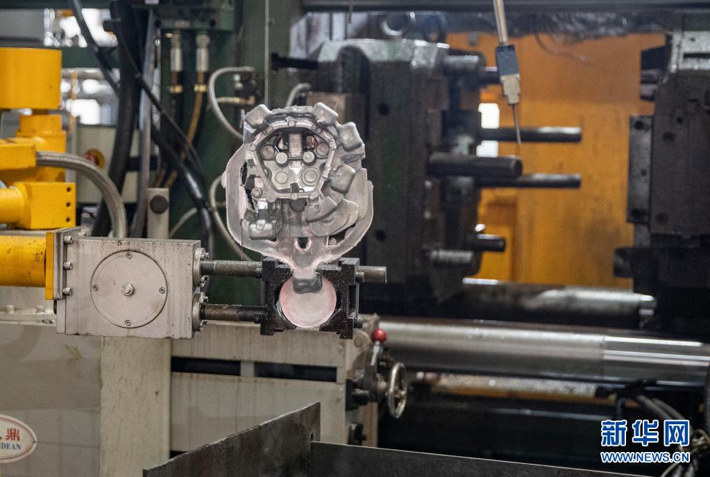 5月18日,在重庆嘉泰精密机械有限公司压铸车间,智能机械臂将压铸件从压铸模具中取出。