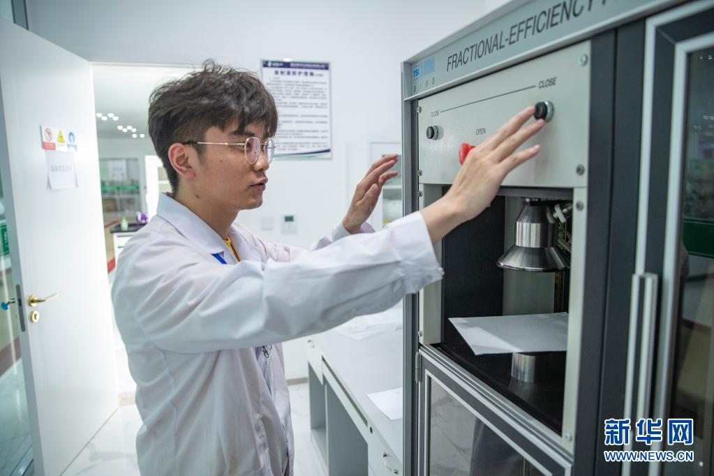 5月18日,在重庆再升科技股份有限公司技术研发中心,工作人员运用分级效率测试仪来测试纸张对颗粒物的过滤效率。