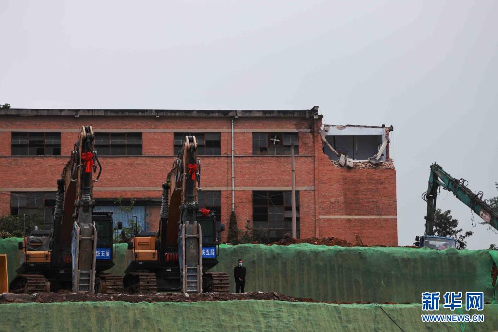 5月19日,在集中开工仪式现场,大型设备准备进行建筑拆除。