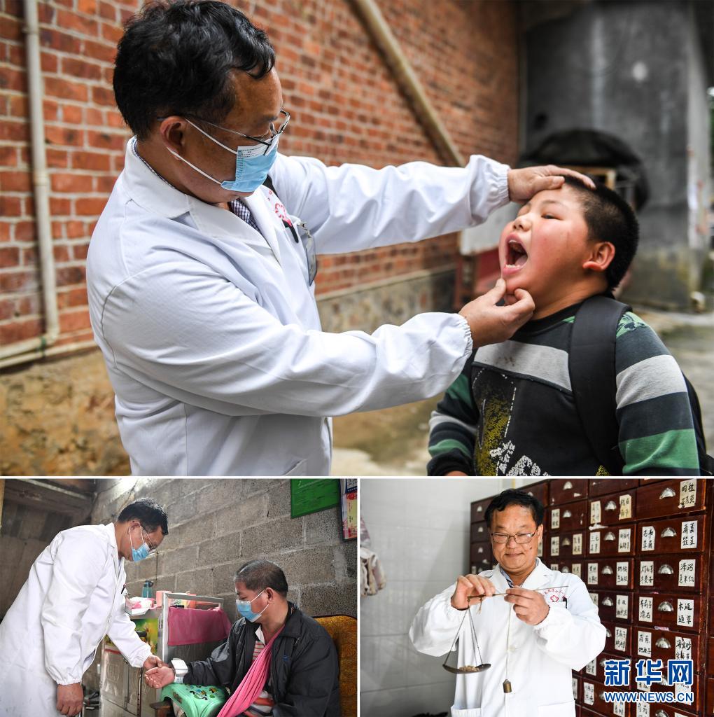 这是一张拼版照片。上:黄日雷为一名儿童查看口腔健康(新华社记者 曹祎铭 摄);左下:黄日雷(左)给村民量血压(新华社记者 周华 摄);右下:黄日雷将中药材称重(新华社记者 曹祎铭 摄)(2020年4月22日摄)。