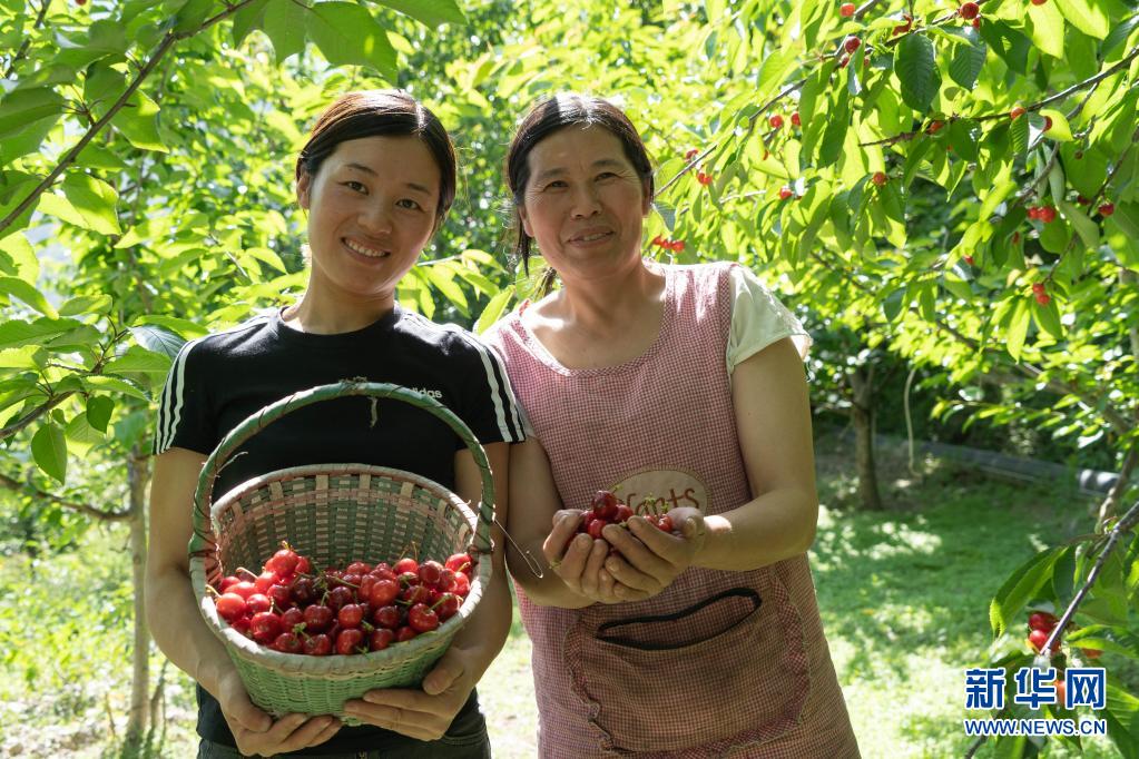 5月8日,在四川省阿坝藏族羌族自治州汶川县绵虒镇,高秀和(右)与女儿吴光晓在自家车厘子地里合影。新华社记者 胥冰洁 摄