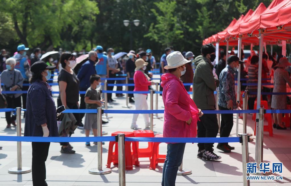 5月19日,在沈阳市和平区太原街街道中山公园检测点,市民有序排队进行核酸检测。