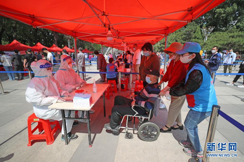 5月19日,在沈阳市和平区太原街街道中山公园检测点,志愿者协助行动不便的市民进行核酸检测。
