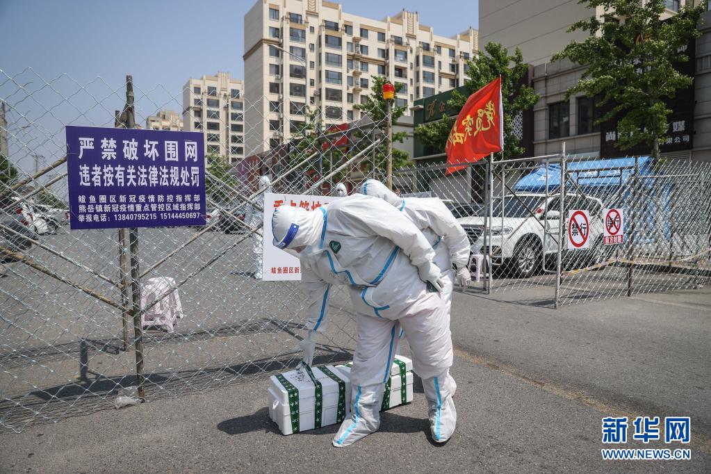5月19日,志愿者在鲅鱼圈区幸福社区紫金湾小区封闭管控区域的出入卡点为市民运送生活用品。