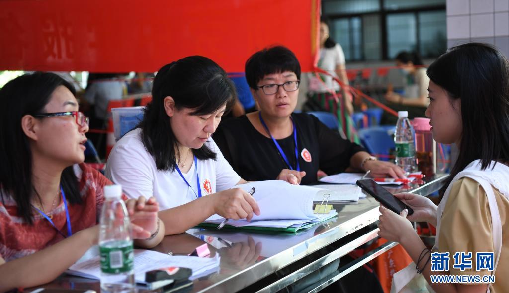 5月19日,招聘学校代表在华南师范大学与应聘者(右)交流。