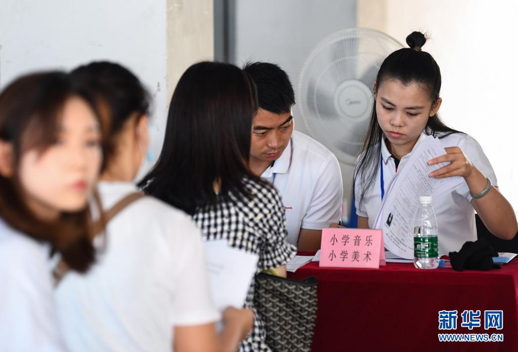 5月19日,招聘学校代表(右)在查看应聘者简历。