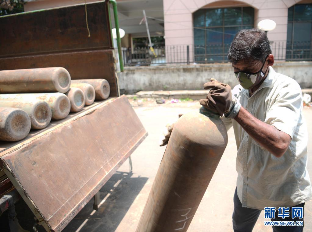 5月19日,工人在印度阿加尔塔拉街头搬运氧气瓶。