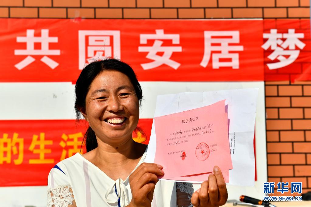 在菏泽市鄄城县旧城镇六合社区(三合村村台),王庄村村民在展示自己的选房确认单(2020年9月20日摄)。