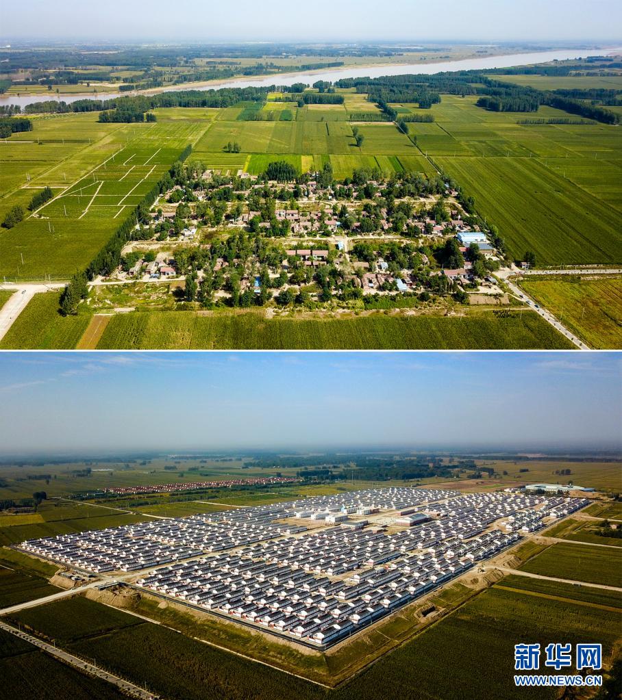 拼版照片:上图为即将要迁建的菏泽市鄄城县旧城镇王庄村(2020年9月20日摄,无人机照片);下图为菏泽市鄄城县旧城镇王庄村即将要整体迁入的六合社区(三合村村台)(2020年9月20日摄,无人机照片)。