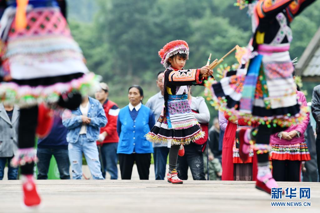 5月19日,在贵州省龙里县谷脚镇茶香村,孩子们在庆祝活动中跳芦笙舞。
