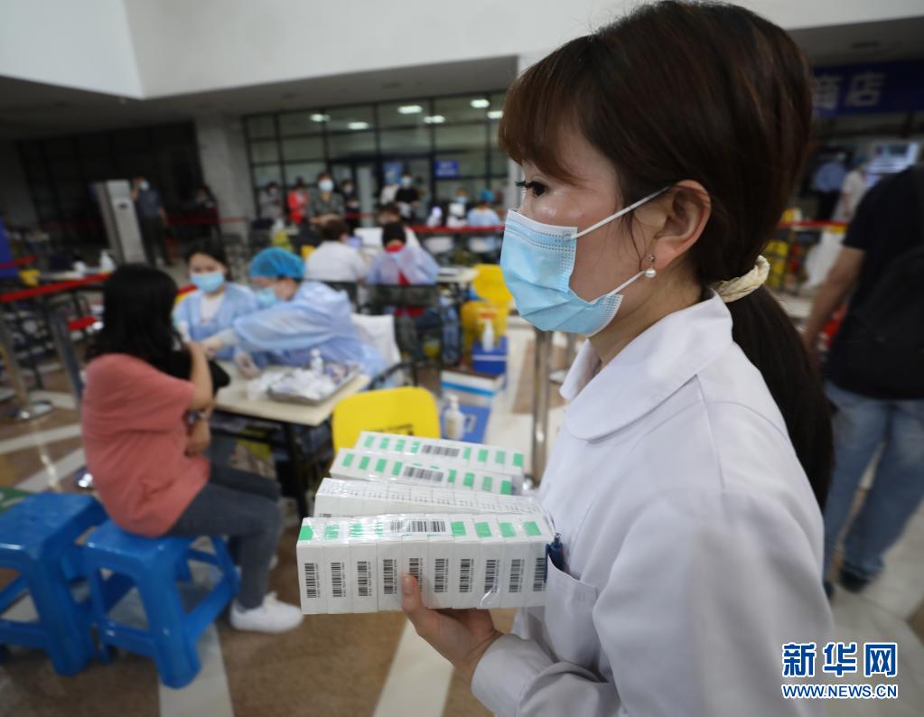 5月19日,苗佳婷在沈阳市大东区新冠疫苗接种方舱里给同事送疫苗。