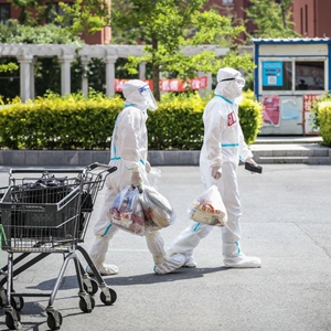 5月19日,工作人员为鲅鱼圈区熊岳镇辽海花园小区居民送去生活用品。