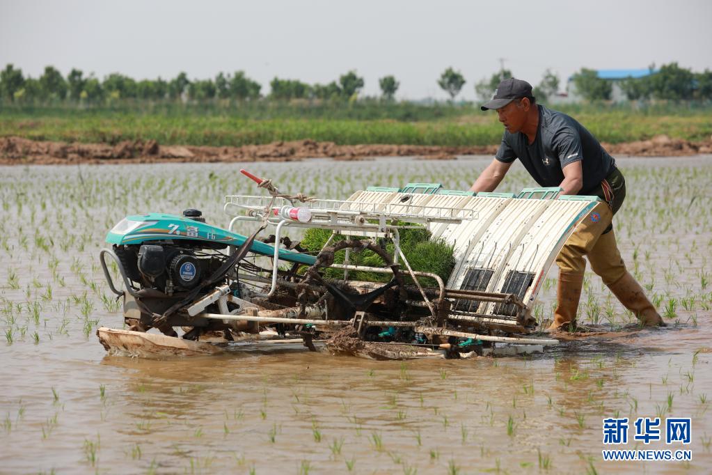 5月19日,沧县春润农业合作社工作人员在田间插秧。