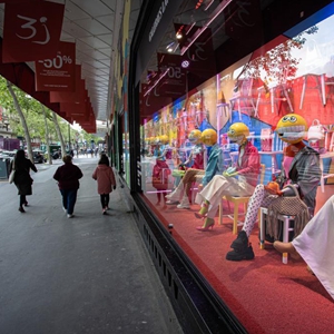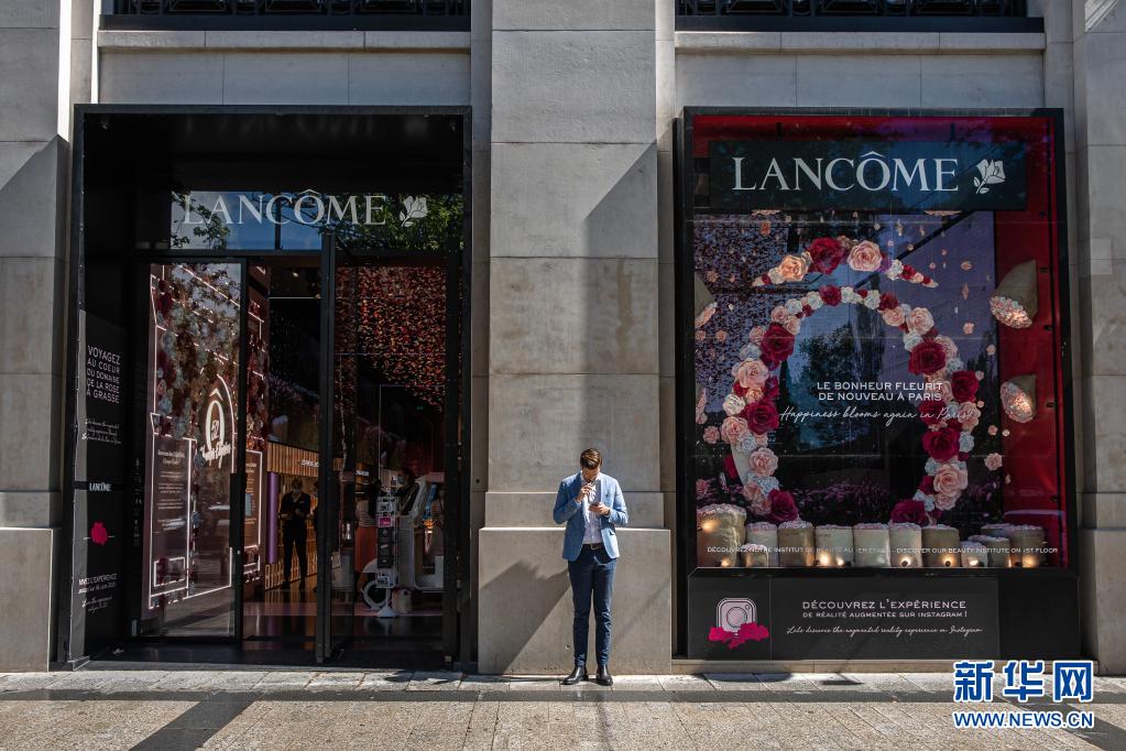 5月19日,在法国巴黎香榭丽舍大街,一名男子站在一家重新营业的商店前。