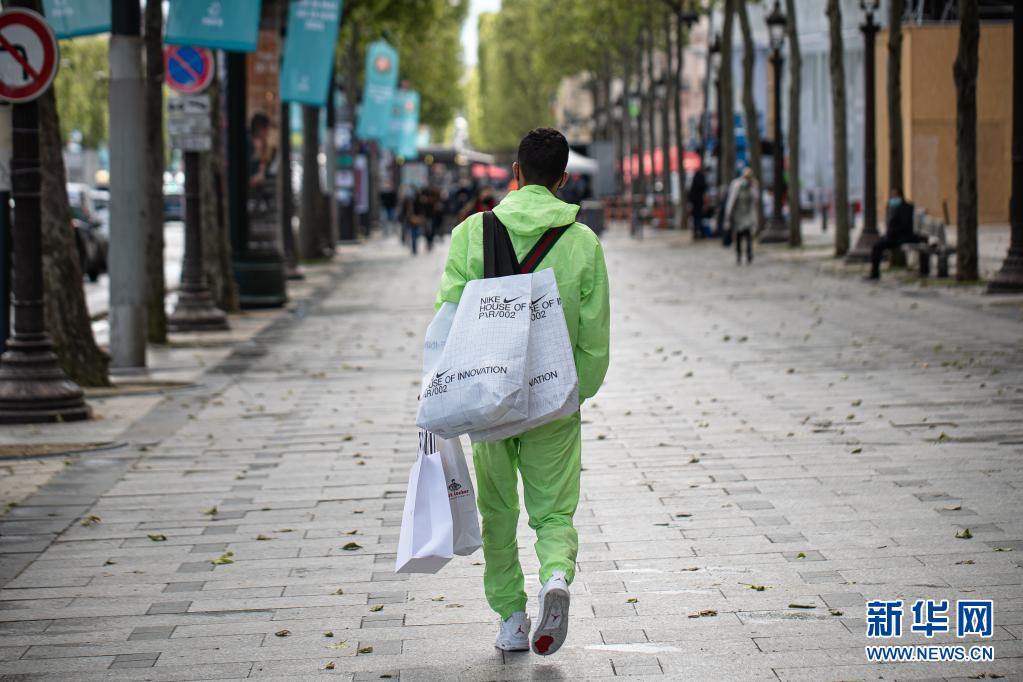 5月19日,在法国巴黎,一名背着购物袋的男子走在香榭丽舍大街上。