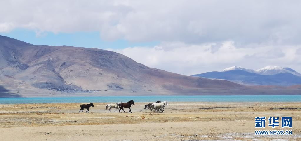 野马在佩枯错旁奔驰(5月14日摄,手机照片)。