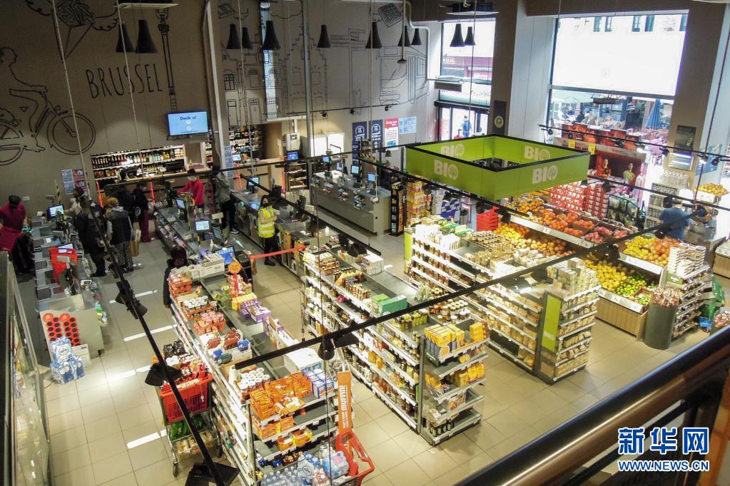 5月19日,顾客在比利时布鲁塞尔的一家超市购物。欧盟统计局18日发布的数据显示,今年一季度,欧元区和欧盟经济分别环比下降0.6%和0.4%,均为连续第二个季度下滑。新华社记者 郑焕松 摄