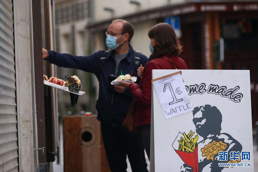5月19日,人们在比利时布鲁塞尔的一家食品店购买华夫饼。欧盟统计局18日发布的数据显示,今年一季度,欧元区和欧盟经济分别环比下降0.6%和0.4%,均为连续第二个季度下滑。新华社记者 郑焕松 摄
