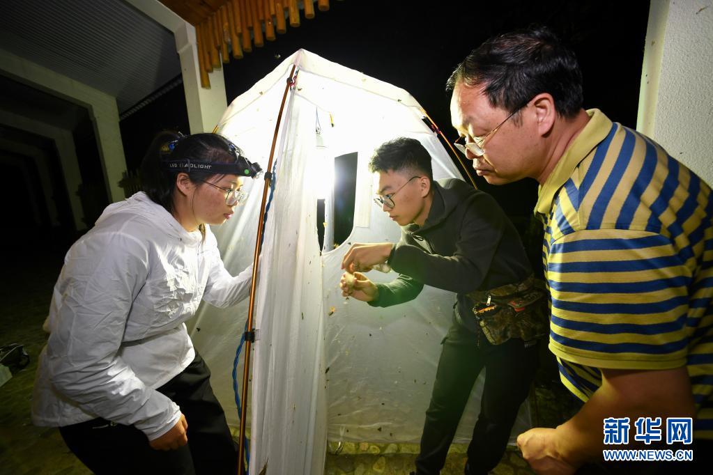 5月17日晚,昆虫专项科考队员在武夷山国家公园生物资源本底调查时收集灯光诱捕的飞蛾标本。新华社记者姜克红摄