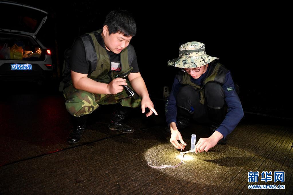 5月16日,两栖爬行类专项科考队员夜晚在武夷山国家公园桐木村附近调查时采集路上死亡小蛇的组织样本。新华社记者姜克红摄