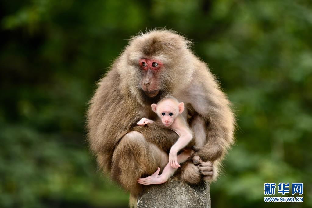 5月16日,武夷山国家公园一只野生藏酋猴抱着小宝宝在桥头停留。新华社记者姜克红摄