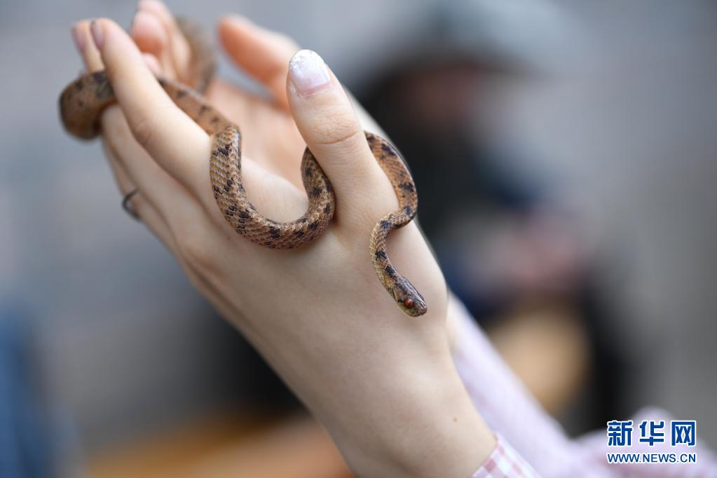 5月17日,一只在武夷山国家公园生物资源本底调查时发现的无毒的福建钝头蛇在女孩手间爬行。新华社记者姜克红摄