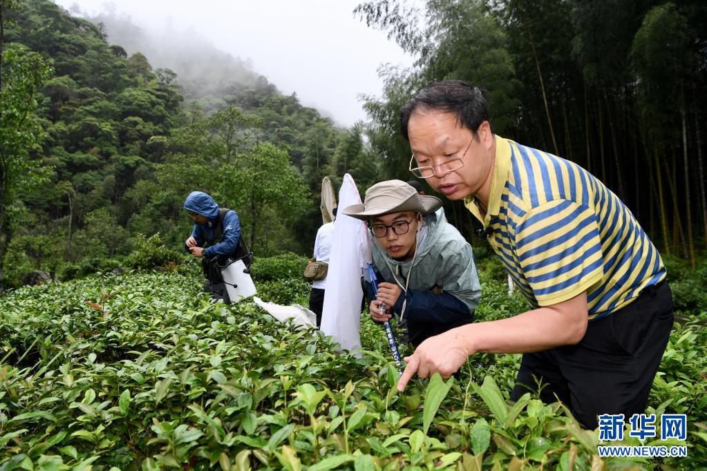 5月17日,华南农业大学昆虫学系教师、博士生导师王敏(右)在武夷山国家公园大竹岚带领昆虫专项科考队员开展调查。新华社记者姜克红摄