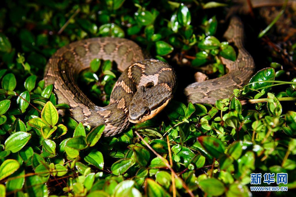 5月16日,武夷山国家公园桐木村附近山林中一只颈棱蛇在草间停留。新华社记者姜克红摄