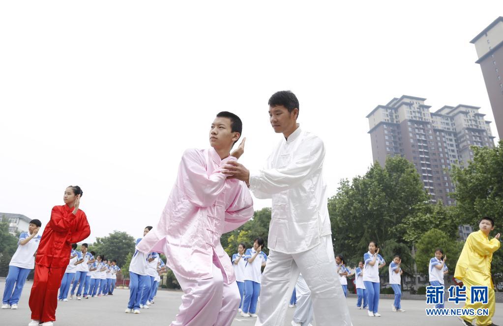 5月20日,邢台市第七中学教师指导学生练习“五禽戏”。