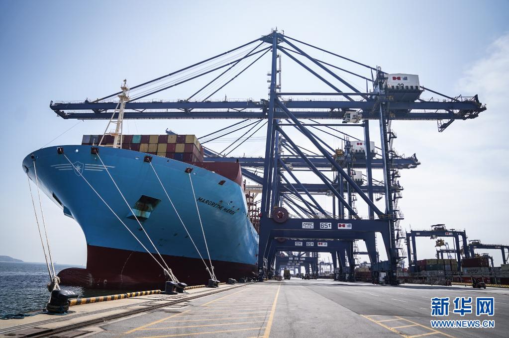 5月14日,货轮在大连港大连集装箱码头有限公司港口装卸集装箱。