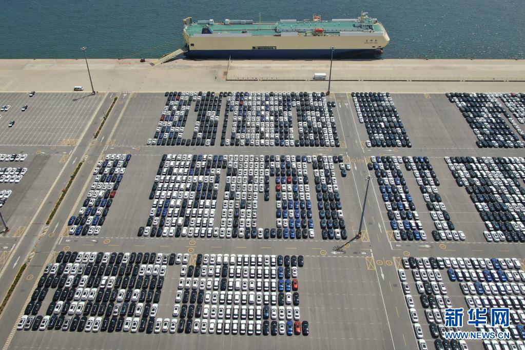 这是5月14日拍摄的停放在大连港大连汽车码头有限公司港口停车场的新车(无人机照片)。