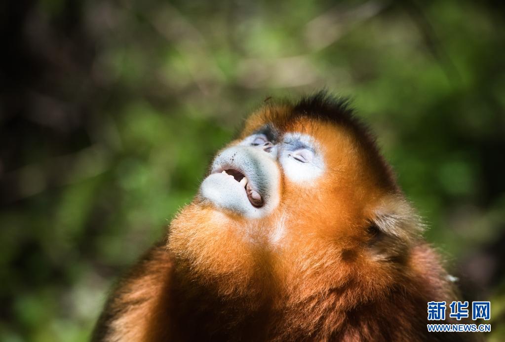 5月19日,一只金丝猴在神农架国家公园大龙潭金丝猴野外研究基地山林中。