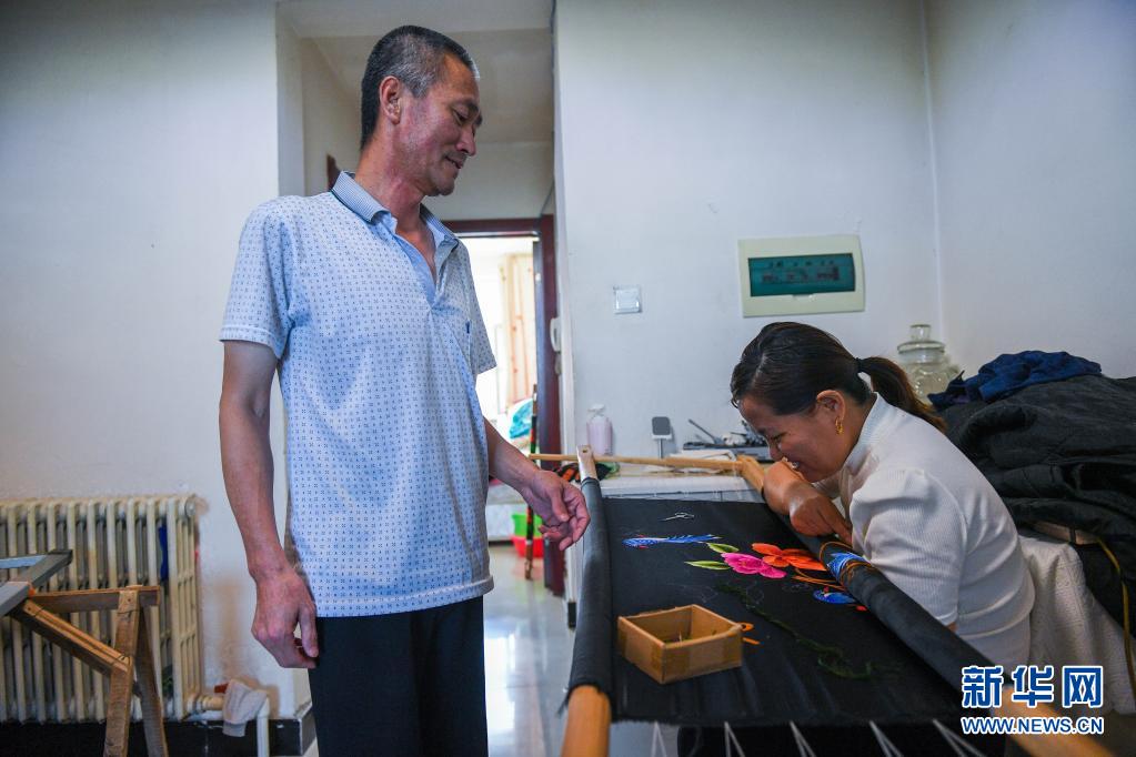 3月23日,曹峰在家中和妻子包风艳交流刺绣工艺。