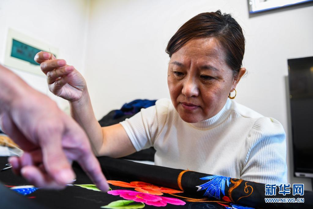 3月23日,曹峰在家中指导妻子包风艳刺绣。