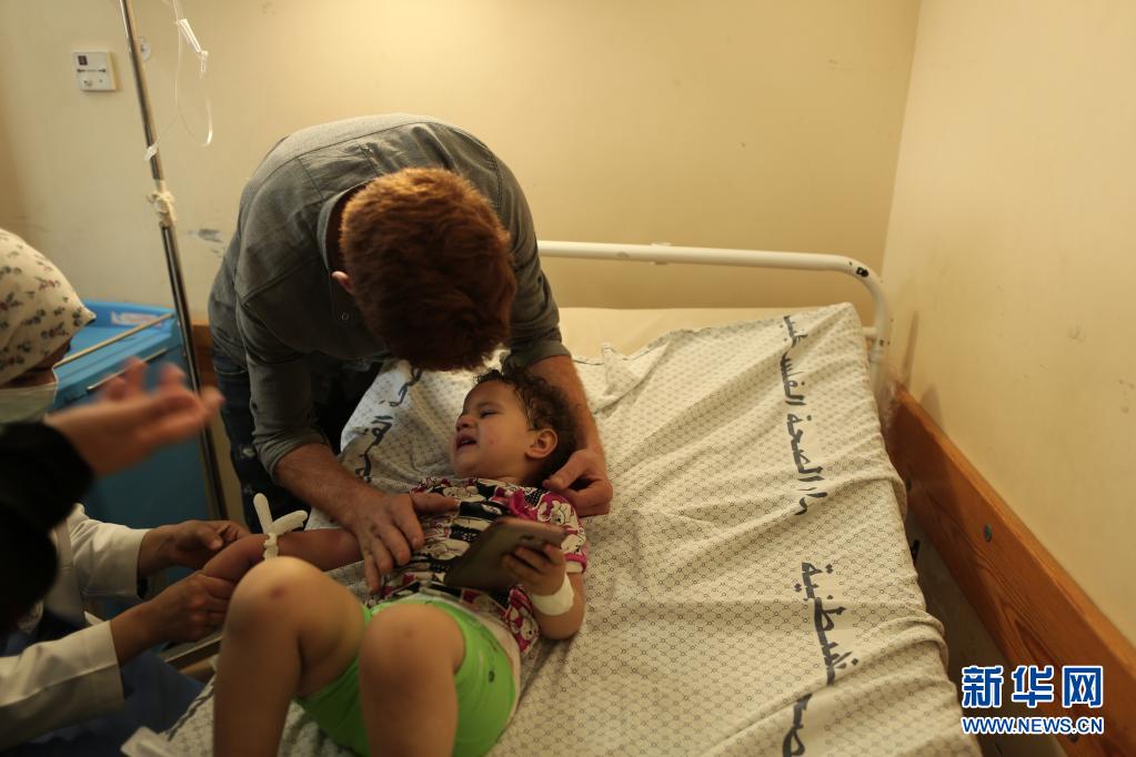 5月20日,一名因空袭受伤的巴勒斯坦儿童在加沙地带城市汗尤尼斯的医院中接受治疗。