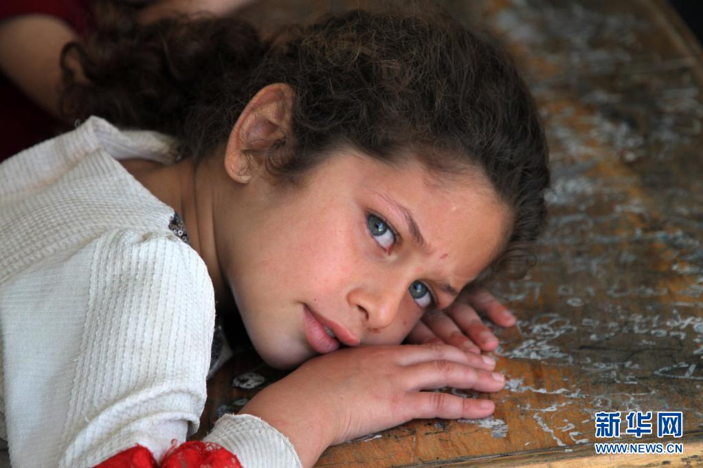 5月19日,受空袭影响而逃离家园的7岁巴勒斯坦儿童巴斯马·阿布·拉萨斯在加沙城的一所学校临时栖身。