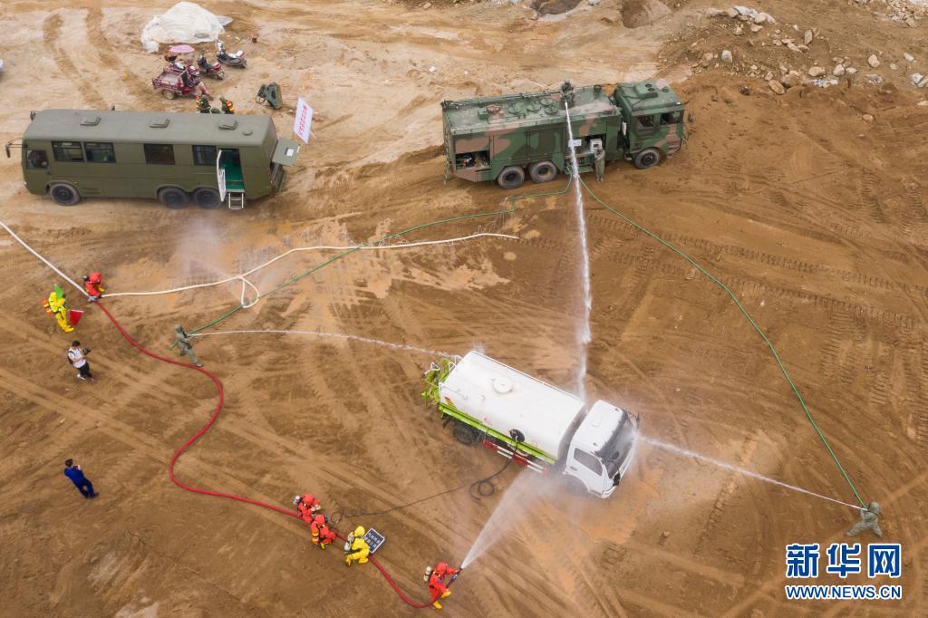 5月20日,参演人员在湖北省宜昌市秭归县演习现场使用防化喷洒车对危化运输车进行防害处置(无人机照片)。