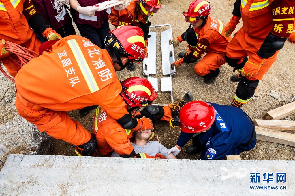 5月20日,参演人员在湖北省宜昌市秭归县演习现场演练转移“伤员”。