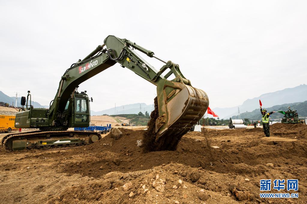 5月20日,参演人员在湖北省宜昌市秭归县演习现场利用远程遥控挖掘机开展救援演练。