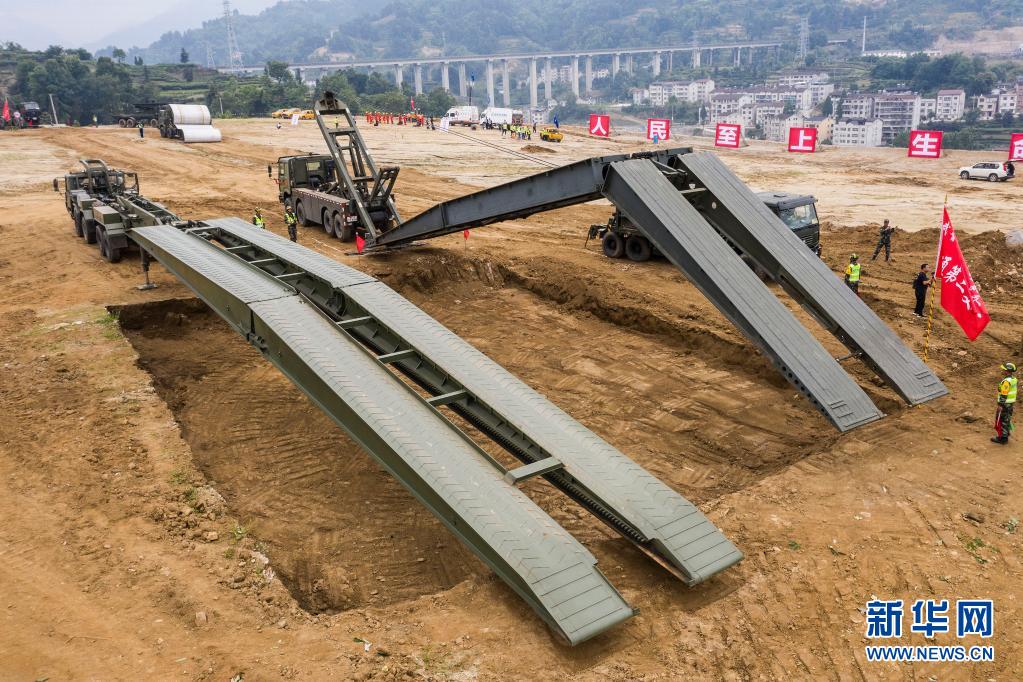 5月20日,参演人员在湖北省宜昌市秭归县演习现场搭建应急机械化桥梁(无人机照片)。