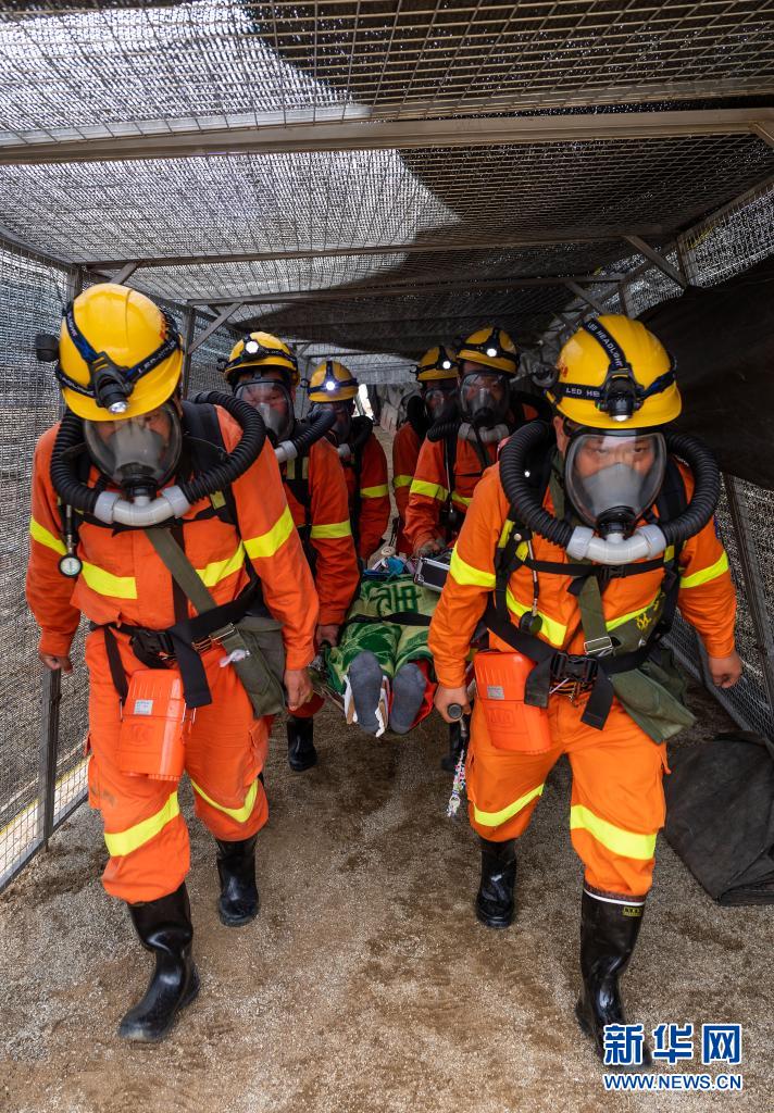 5月20日,参演人员在湖北省宜昌市秭归县演习现场转移“伤员”。