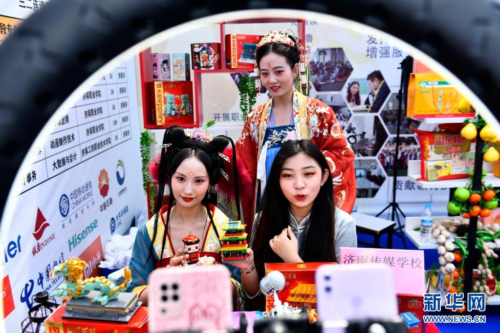5月20日,在山东国际会展中心,济南传媒学校学生展示“直播带货”。