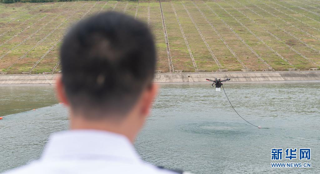 5月20日,在河南省南阳市淅川县陶岔渠首水质自动监测站,水质专员尹延震操作无人机采集水样。