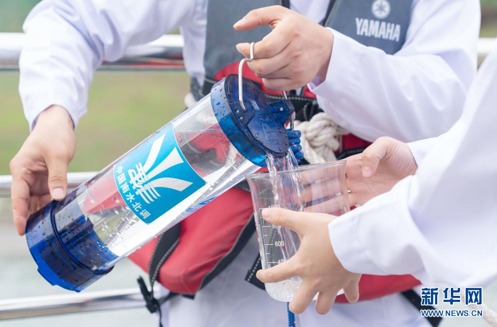 5月20日,在河南省南阳市淅川县陶岔渠首水质固定监测站点,工作人员采集水样。