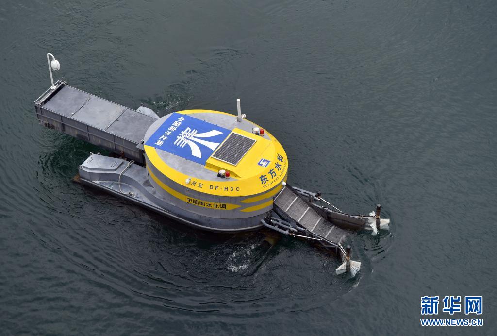 5月20日,在河南省南阳市淅川县南水北调中线工程陶岔渠首处,清漂机器人在作业中。这种机器人外观看起来像一艘小船,它用前方的触角收集小漂浮物,内置的过滤细网孔径最小只有5毫米,足以让漂浮物“无处遁形”。