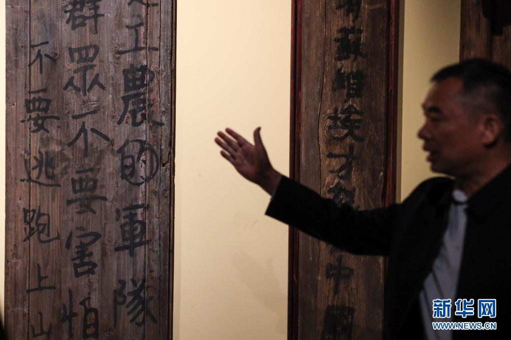 5月18日,黎平会议纪念馆馆长张中俞在讲解红军长征时留下的标语内容。新华社记者 欧东衢 摄